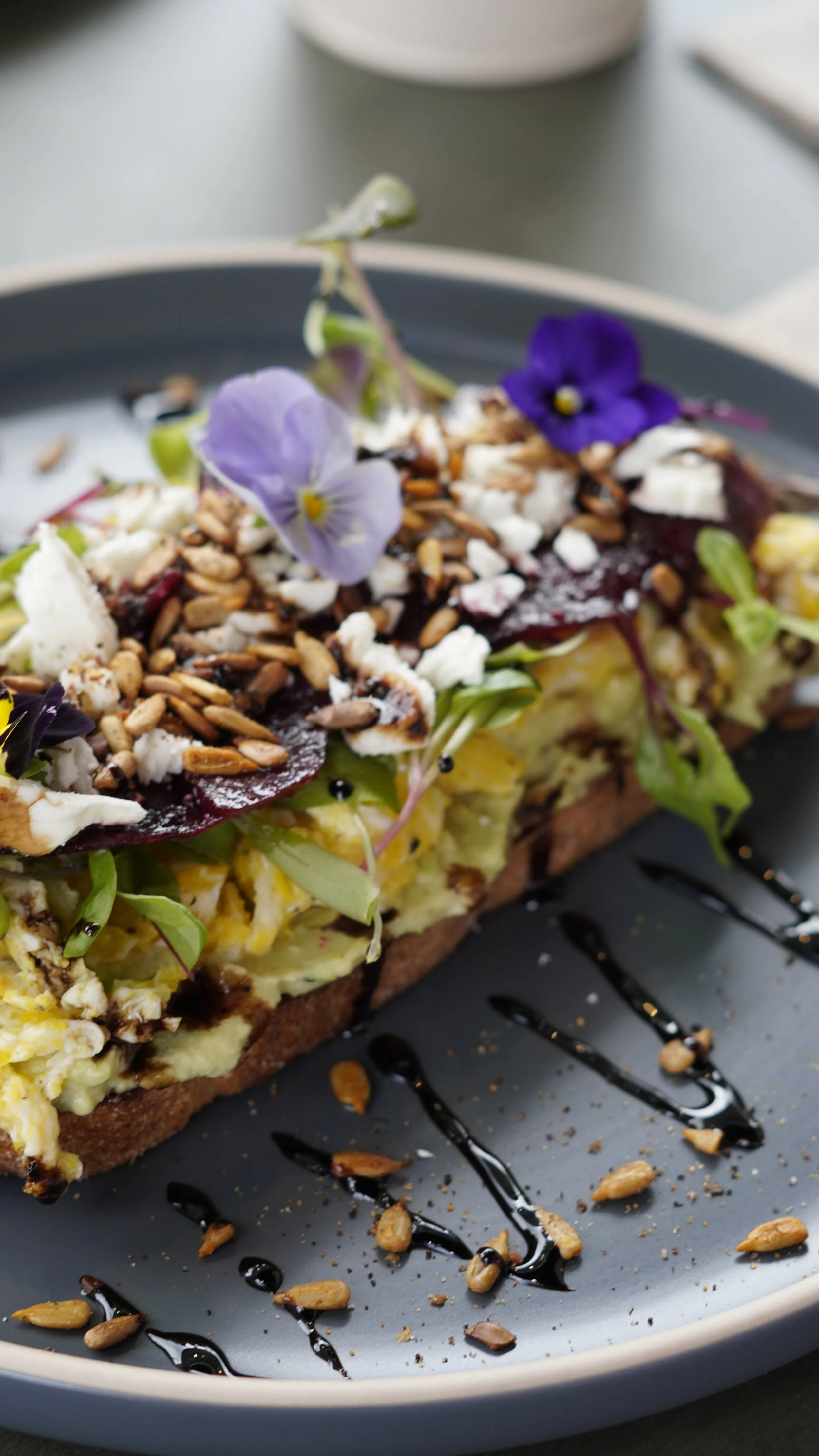 Tostada de aguacate + queso feta + reducción de balsámico + láminas de remolacha confitada + semillas de girasol